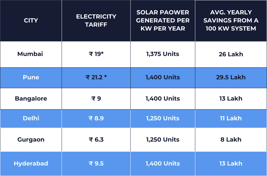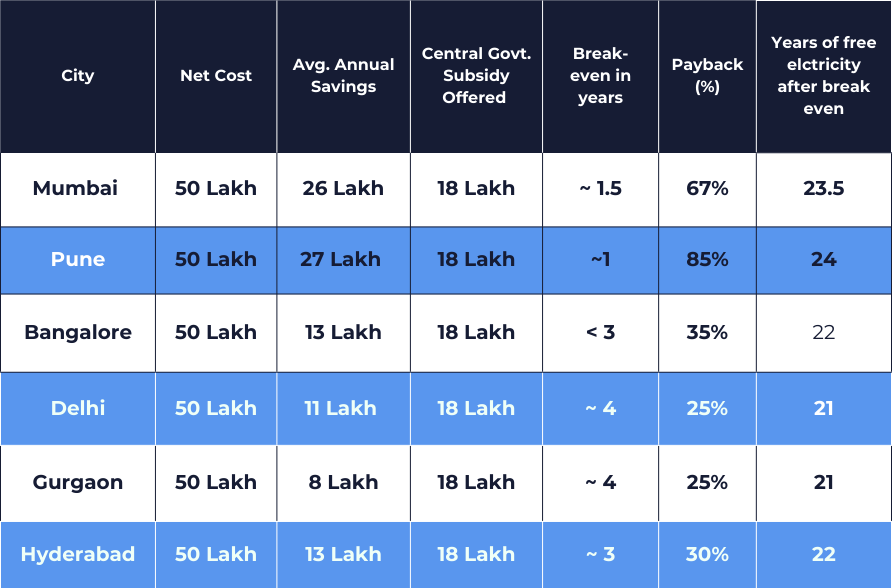 Here’s the average break-even period for a 100 kW system in cities like Mumbai, Pune, Bangalore, Delhi, Gurgaon, and Hyderabad.